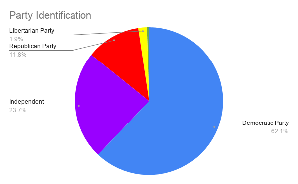 There is a clear Democratic majority at the IA with about 62.1% of voters identifying as such. However, Independents make up a sizable minority at 23.7% of voters, and Republicans at just over 10%. Those identifying as Libertarians and Greens are in the minority at about 3%.