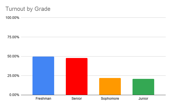 The Freshmen had the greatest voter turnout at 37.6% of the votes cast, with Seniors closely following at 33.0%. Sophomores and Juniors each made up about 15% of the electorate.