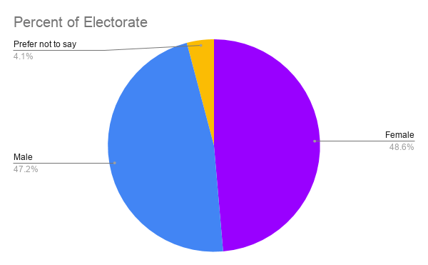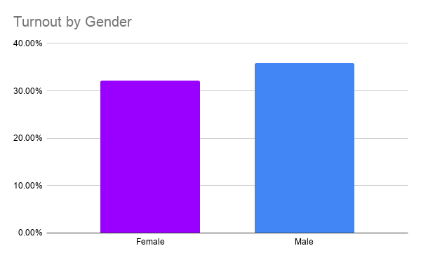 While women comprise a slight majority of the electorate at 48.6% compared to the 47.2% of men, men turned out in slightly greater numbers at 35.9% compared to women’s 32.2% turnout. This displays a reversal of well established national trends showing women consistently turning out at a slightly higher rate compared to men.