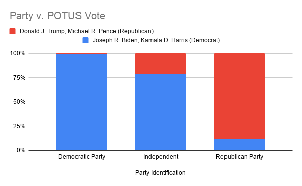 Nearly all Democrats voted for their party’s candidates – Joe Biden and Kamala Harris – compared to just over 85% of Republicans voted for their party’s candidates – Donald Trump and Mike Pence. This reflects national trends which show the vast majority of Democrats in support of Joe Biden, but Republicans are more hesitant to completely support President Trump. In terms of Independents, at the IA, just over 75% voted for Joe Biden and Kamala Harris, which is further evidenced in national polling that show Joe Biden commanding a significant, albeit less obtuse, lead among independent voters.