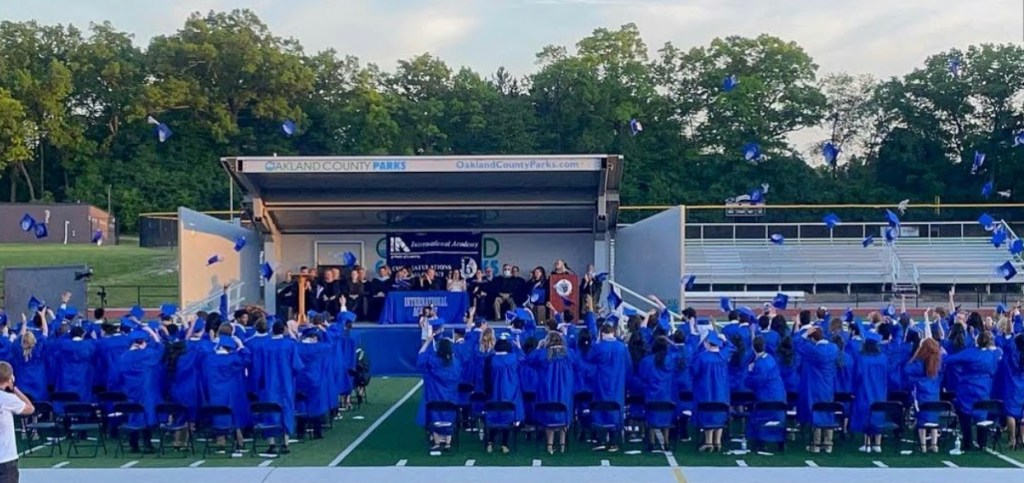 A musical interlude — St. Paul’s Suite — was followed by the presentation of the 2021 graduates by Dr. Smith. The graduates were received and accepted by Superintendent Pat Watson of Bloomfield Hills Schools, who addressed the graduates on their high school experience and next steps in life. Mr. Watson urged all of the graduates to take a minute and look to their left and right, and take it all in. In the words of Wasey, “I’ll never forget the point that Superintendent Pat Watson said the reality that graduation is the last time that I’ll be able to see my class as a whole; it’s probable that some may not make it back to reunion” — truly a bittersweet moment. One by one, to the cheers and pride and sometimes tears from the crowd, the graduates crossed the stage to receive their diplomas. As Charles said, “graduation was the moment for me that really hit. I realized I was done, but walking across the stage, something clicked and I realized that I was no longer a kid — I was walking into adulthood.” After the last senior crossed the stage, the bleachers, filled with family and friends, positively erupted in cheers and applause, as the graduates stood to face the community that had been their rock and family for the past four years.